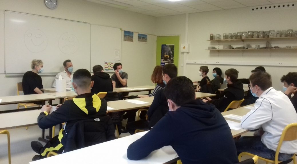 Une équipe de comédiens de la compagnie El AJOUAD a réalisé une pièce, intitulée « Mille Jours », un extrait de Mille francs de récompense, écrit par Victor HUGO en 1866 et interprété de trois manières différentes. Parmi les comédiens, il y avait Etienne DUROT, l’acteur principal, Romaric BOURGEOIS également comédien, musicien et assistant d’Etienne. Enfin, Chloé MARGUERIE a organisé « le bord de scène » pendant lequel nous avons pu échanger sur les thématiques fortes de la pièce ainsi que sur la culture, en général. Jocelyn ROYBIER, du théâtre Gaston Bernard, a également pu décrire le programme auquel la classe est inscrite. Tous espèrent vivement que la situation évolue positivement pour les théâtres de manière à poursuivre ce projet qui donne aux élèves l’envie de mieux connaitre le monde du spectacle.
