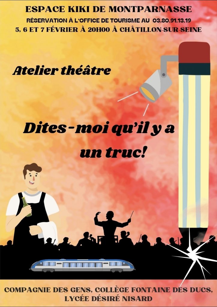Après 5 mois de travail, voici venu le temps de la semaine théâtrale. Les élèves de l’atelier théâtre du lycée seront ravis de vous accueillir pour la restitution les 5, 6, 7 février à 20h, salle Kiki de Montparnasse.
