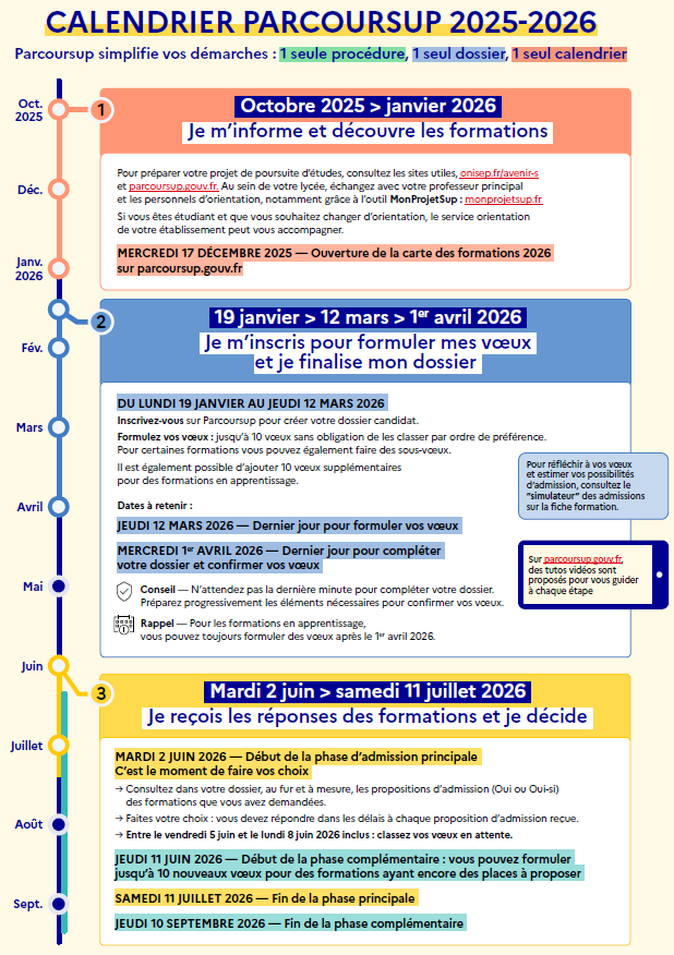 Ce calendrier structuré permet à chacun d’avancer sereinement, en respectant des étapes essentielles pour réussir son entrée dans l’enseignement supérieur.